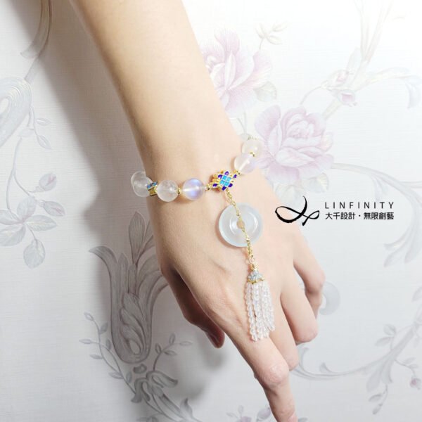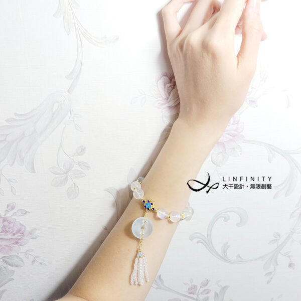 鍊身佐琺瑯盤長(吉祥無盡)、精工編製古典流蘇飾,整體淨雅高潔,靈性至上,是寓意極佳、品相極美之臻品。