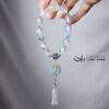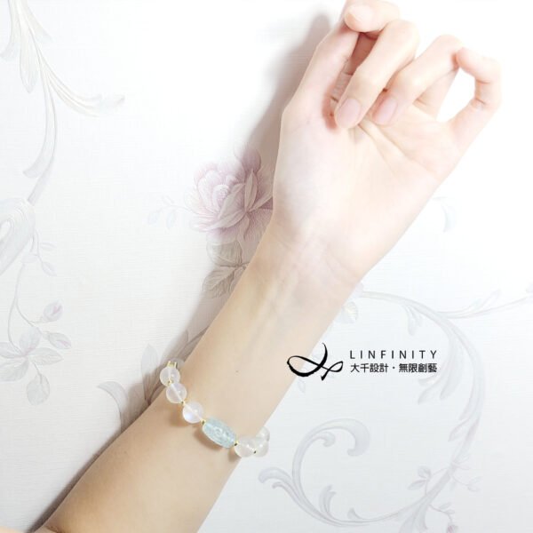 1.圖上藍月光約9.5mm,海藍寶回紋珠長約15.3mm、寬約8.9mm,流蘇(海藍寶古錢+藍月光)約高7.8cm,整體手圍約16.5cm。