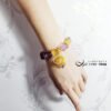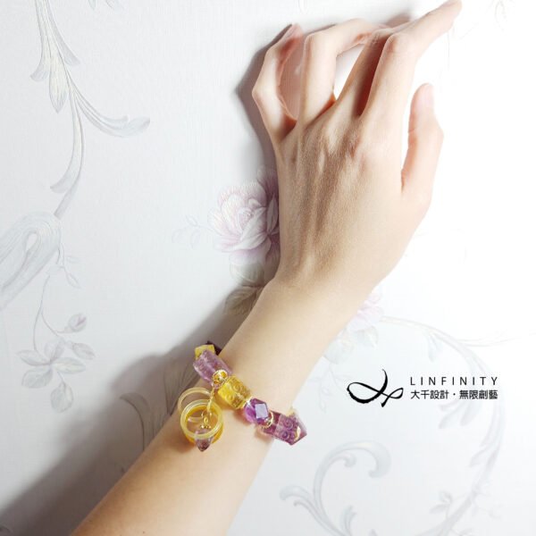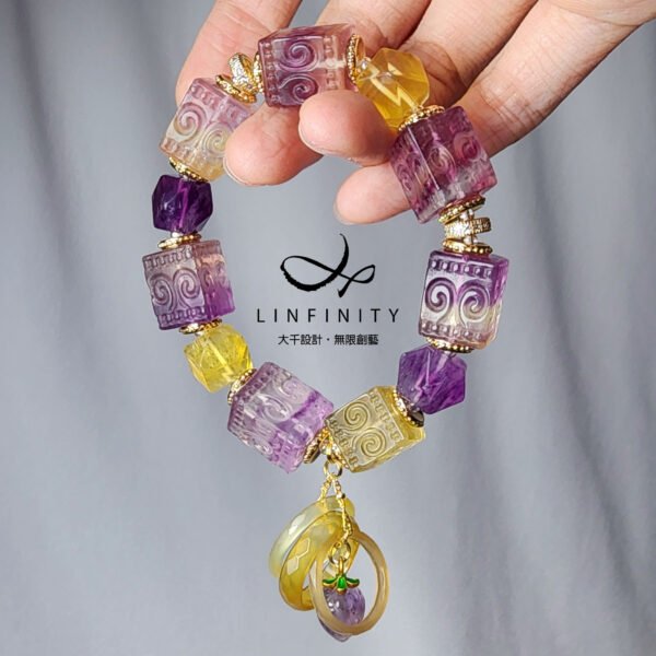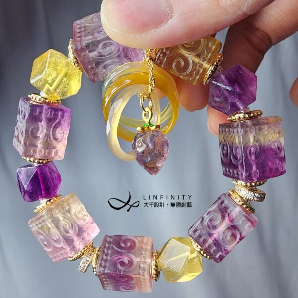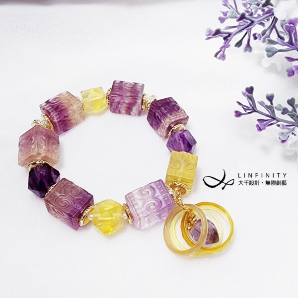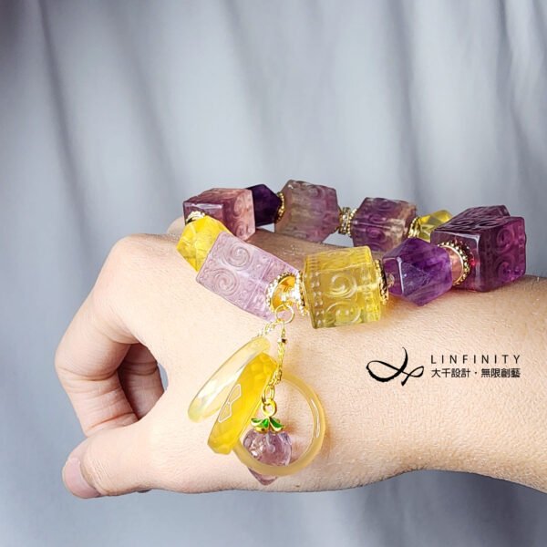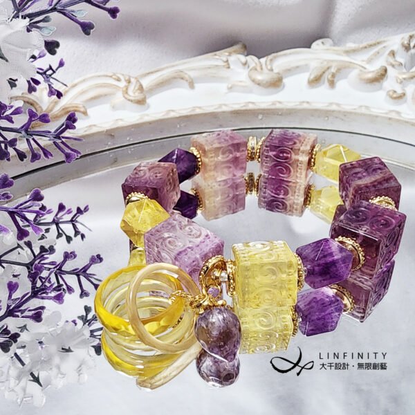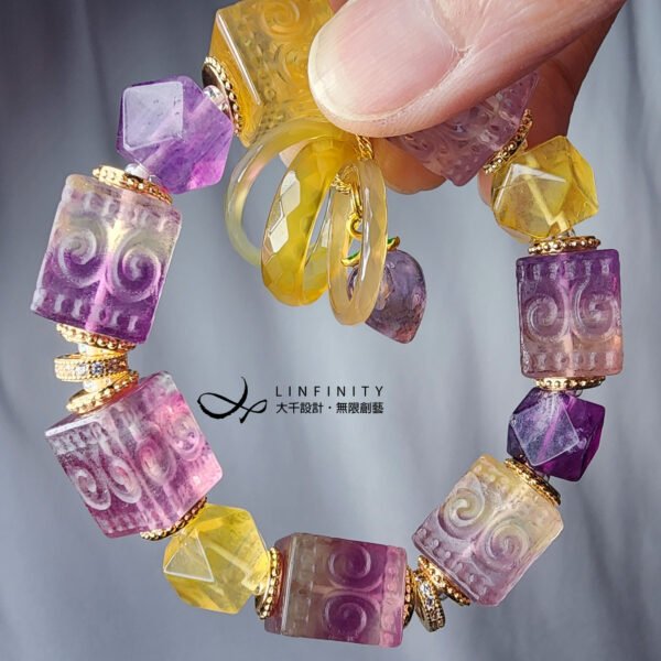 呼應紫黃螢石色調,主飾3只(三元及第)金黃瑪瑙戒環、紫黃晶草莓墜飾,戒環鑽面閃耀、晶體透亮、水光極美,融合玉振金聲(象徵智慧、德行、君子、美女)概念,寶石敲擊聲響宛若銀鈴悅耳,如有君子(美女)來,使配戴賞玩饒富趣味,風韻細緻,靜謐優雅之餘,不失大器、富貴、優雅之情。
