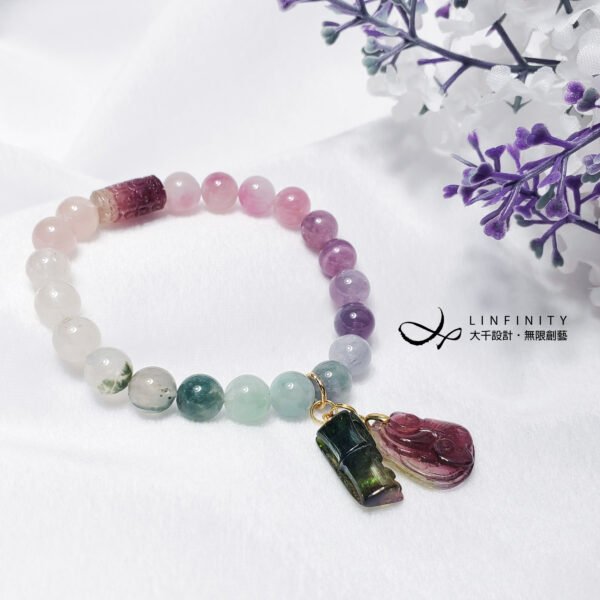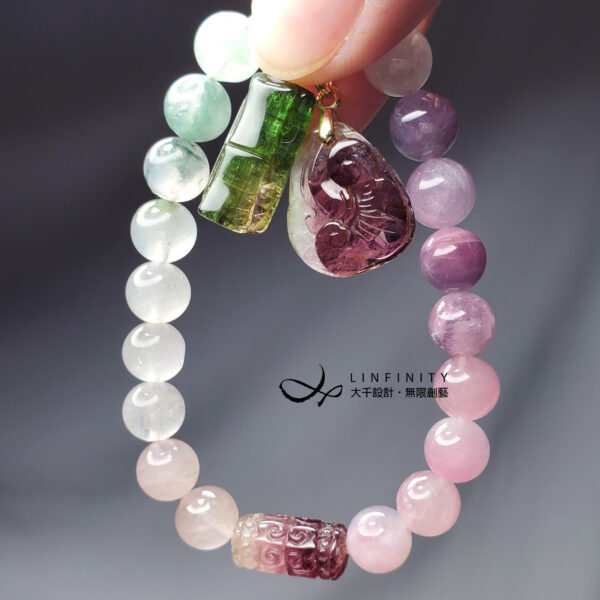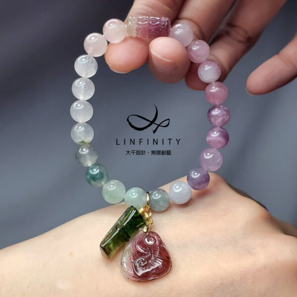 嚴選頂級西瓜碧璽,巧雕如意(如人所意、吉祥富貴)、竹節(節節高升)、回紋(吉祥無盡),鍊身為漸層彩虹梅花碧璽,寶石顆顆西瓜(紅、綠)色明顯,色彩勻淨、火彩閃耀,整體時尚亮麗、細緻優雅。