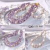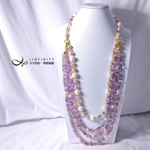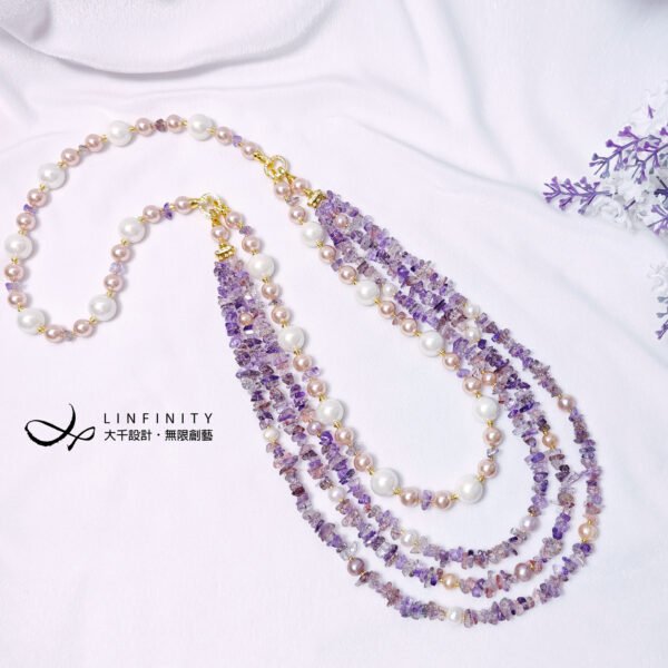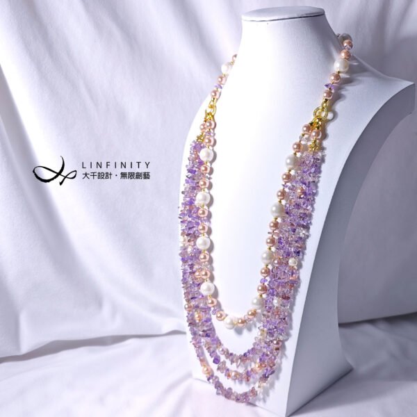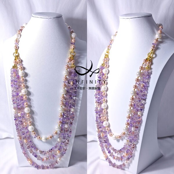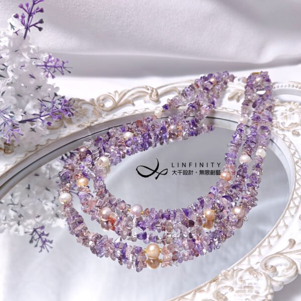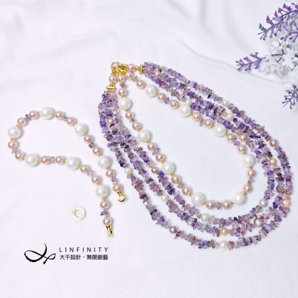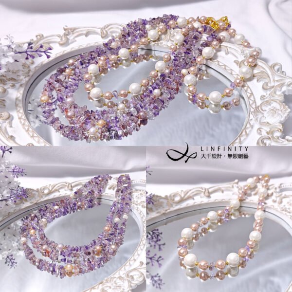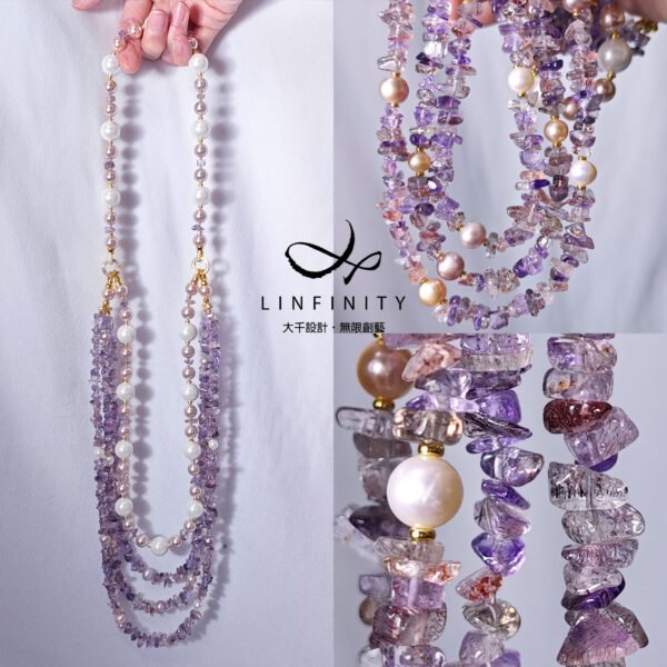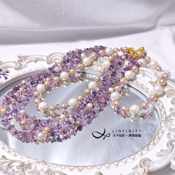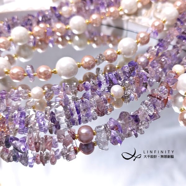 呼應超七水晶的紅紫色,嚴選溫潤高貴白、粉色珍珠與貝珠與之設計,成為本件大紅大紫美人。