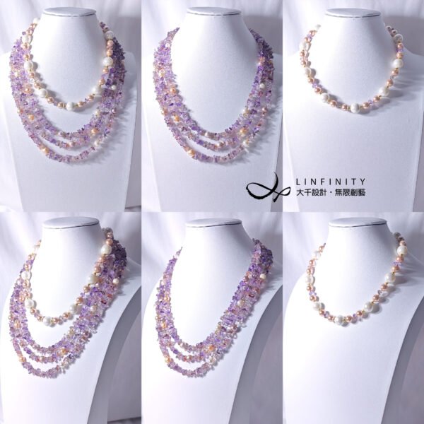設計師精工編製設計鍊身,主人可自行拆裝K金釦件(釦型、圈型),組合為長鍊、短鍊、單鍊、多鍊等,共計5種戴法,形式多元,超七的氣場富貴,珍珠的氣息優美,短鍊顯得簡鍊,長鍊顯得霸氣,每一種戴法都極具特色、無比美麗,秒成為百搭女王。