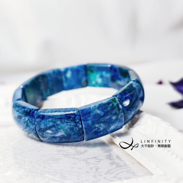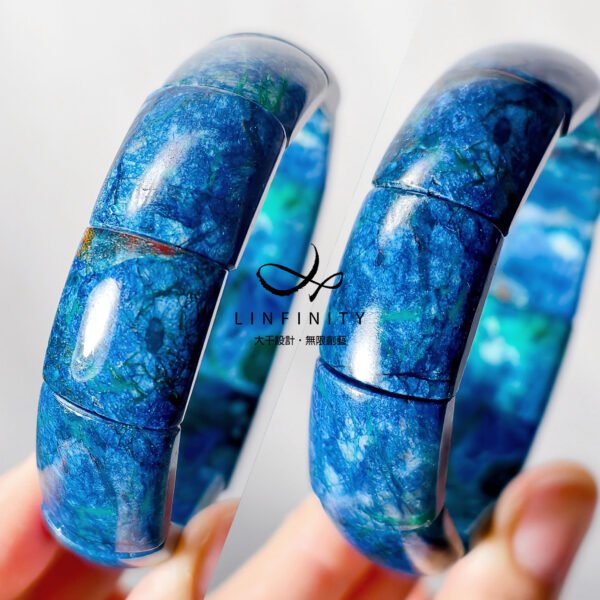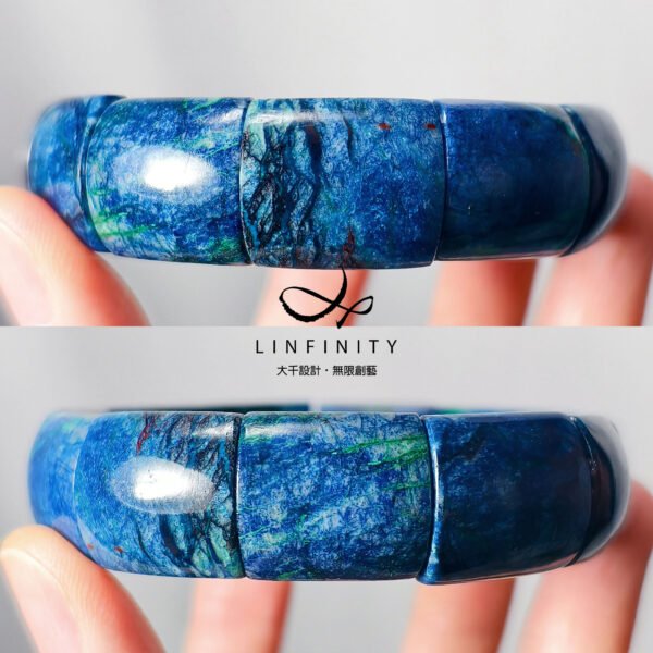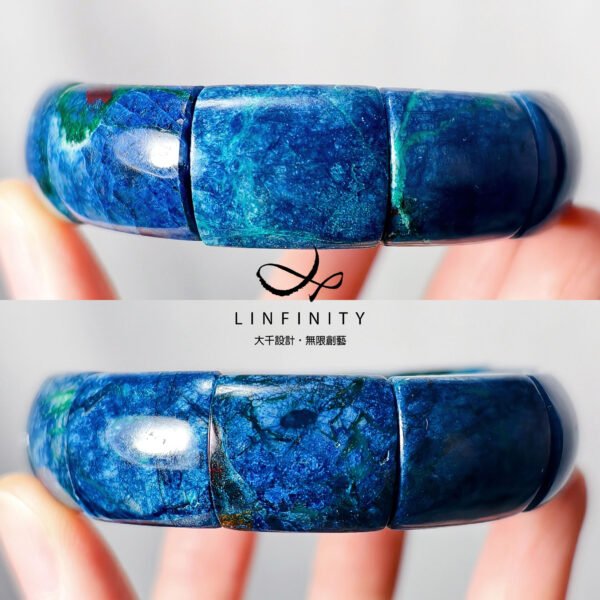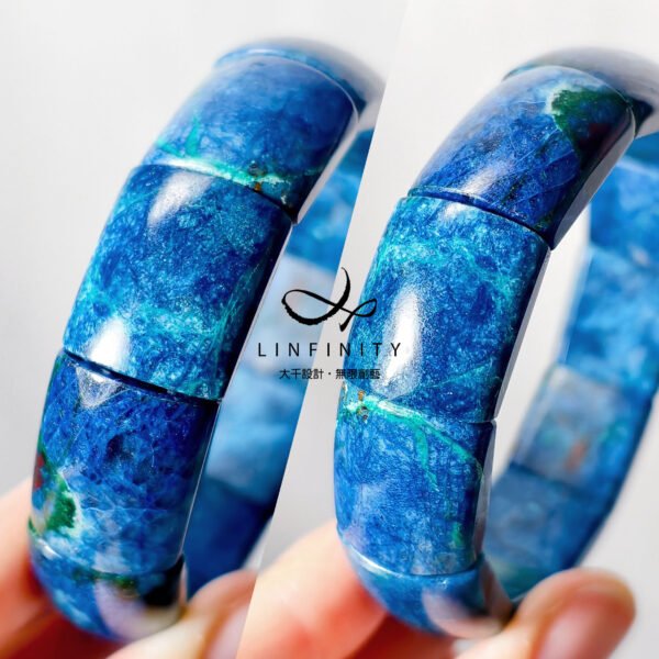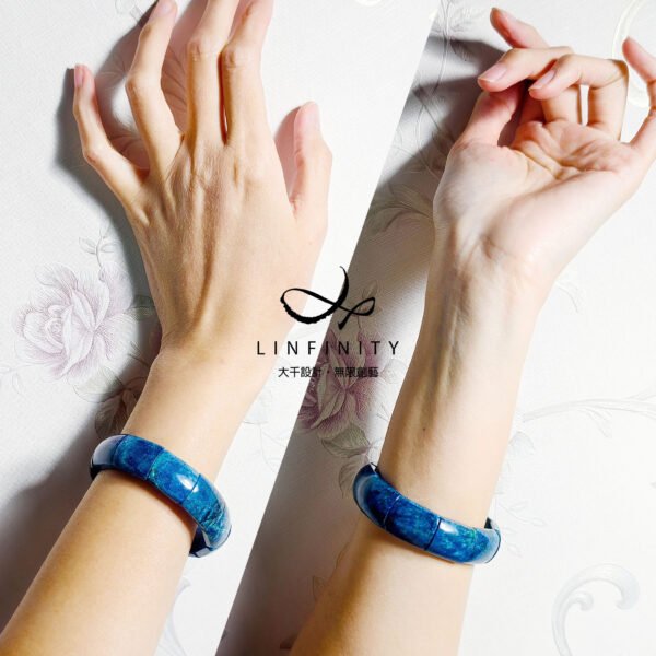 設計師嚴選本件頂級藍銅礦,磨製大器鐲形手排。