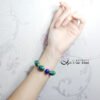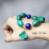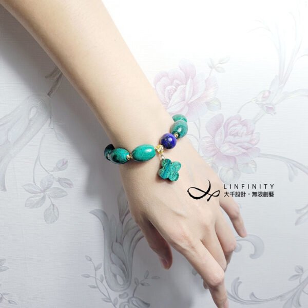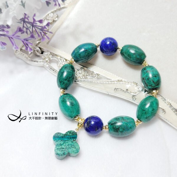 1.圖上青金石圓珠約14mm,藍銅礦鼓珠長約16.8-18.2mm、寬約13.5mm,幸運草墜高約19.6mm、厚6.8mm,手圍約16cm。