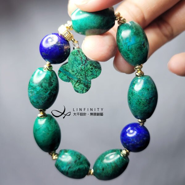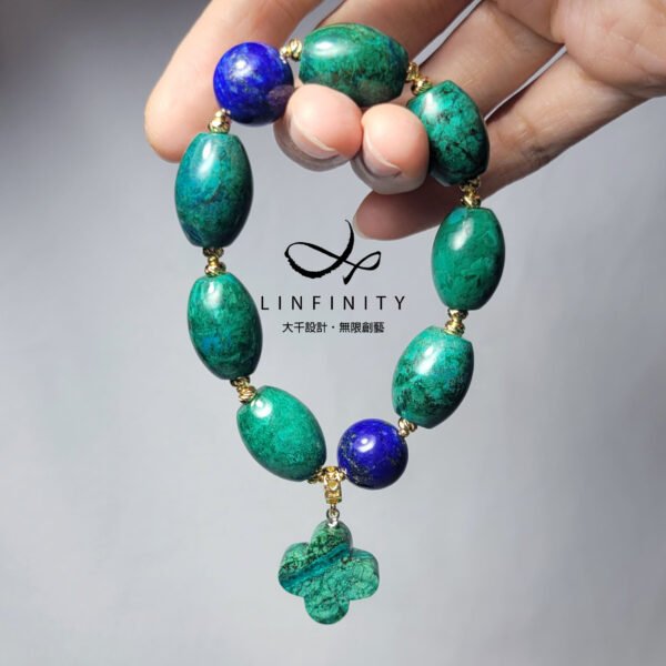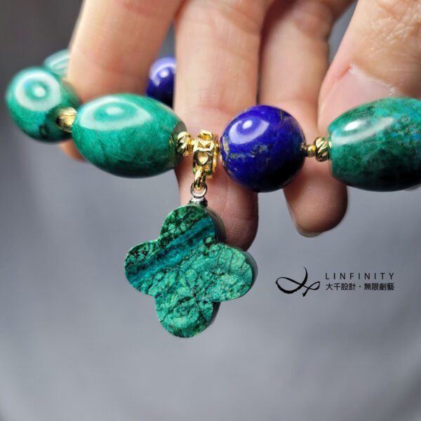 精工磨製藍銅礦幸運草墜,並精選頂級帝王青青金石,與本件藍銅礦的靛藍、天藍、湖藍、孔雀綠呼應,相當富貴大器,寓意美麗。