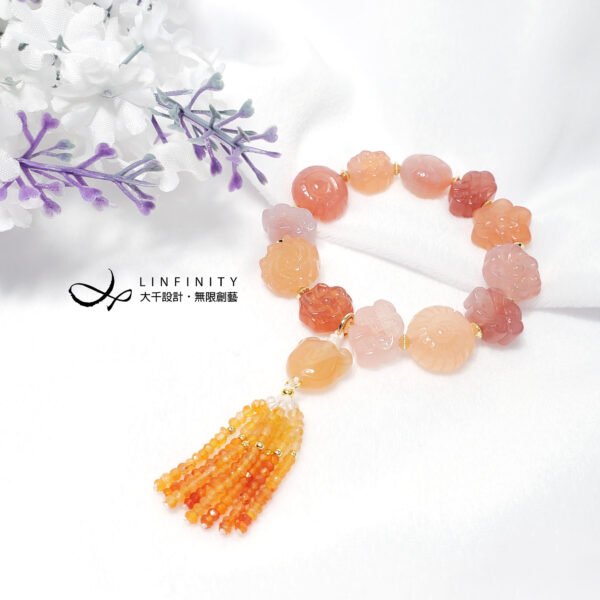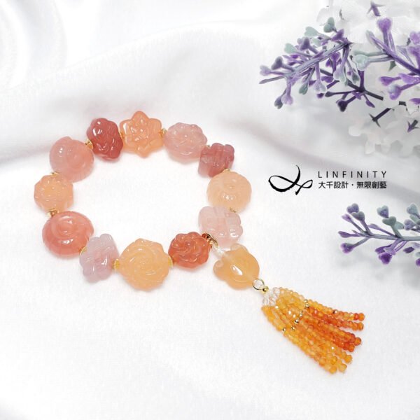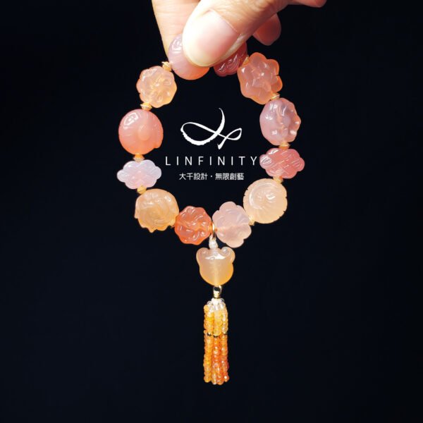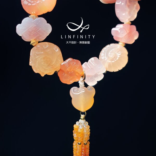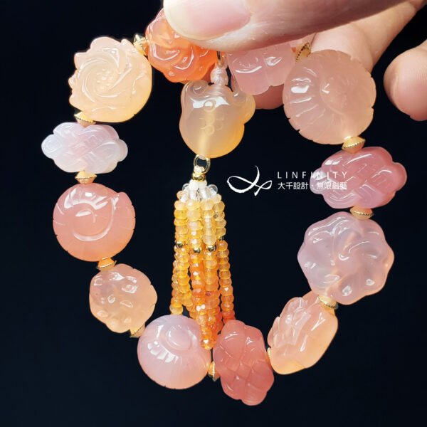 嚴選頂級瑪瑙,精工雕製各式吉祥多寶(花、如意、盤長、螺),寶石顆顆色彩勻淨、透水度高、不含斑點礦缺,富貴華美而大器。