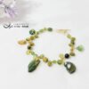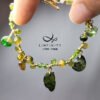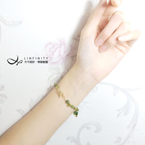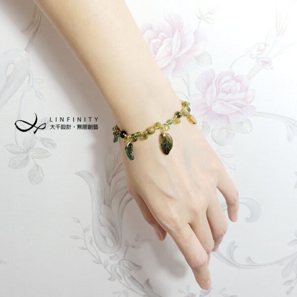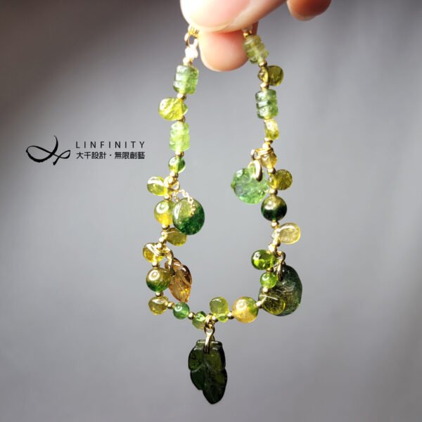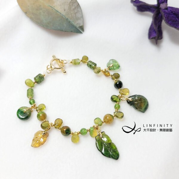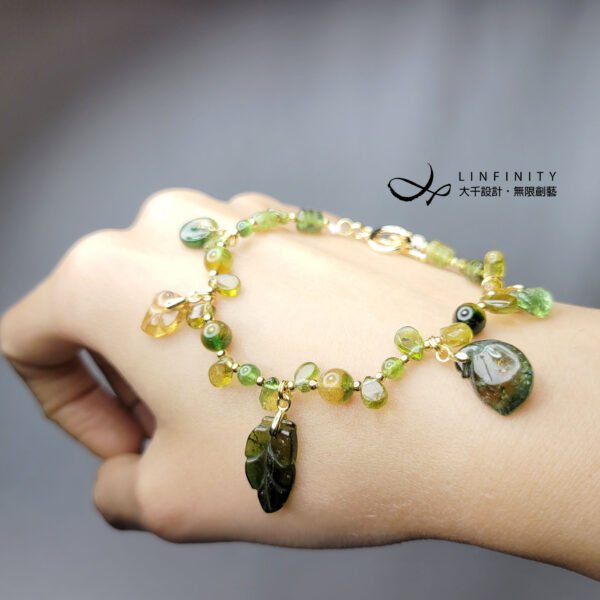 嚴選頂級黃綠西瓜碧璽,巧雕葉(一葉成功、一葉致富)、壽桃(健康長壽、吉祥富貴)、古錢(招財、平安)、回紋(吉祥無盡),多寶釧概念設計,寶石件件色彩勻淨、火彩閃耀,鍊身設計綠意盎然、金光燦燦,不僅時尚亮麗、細緻優雅,更是寓意吉祥。