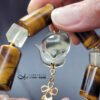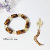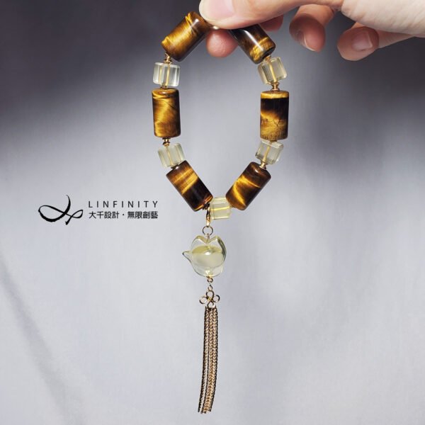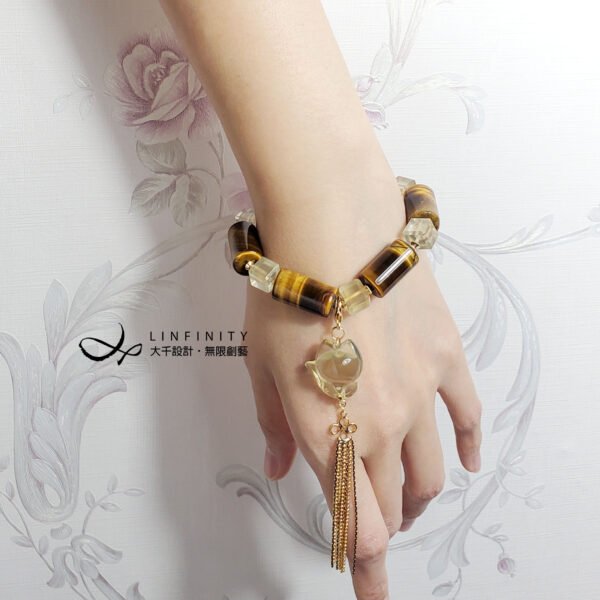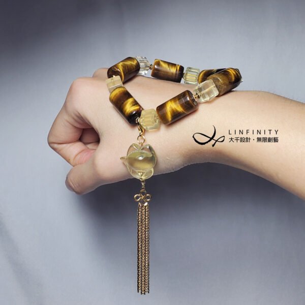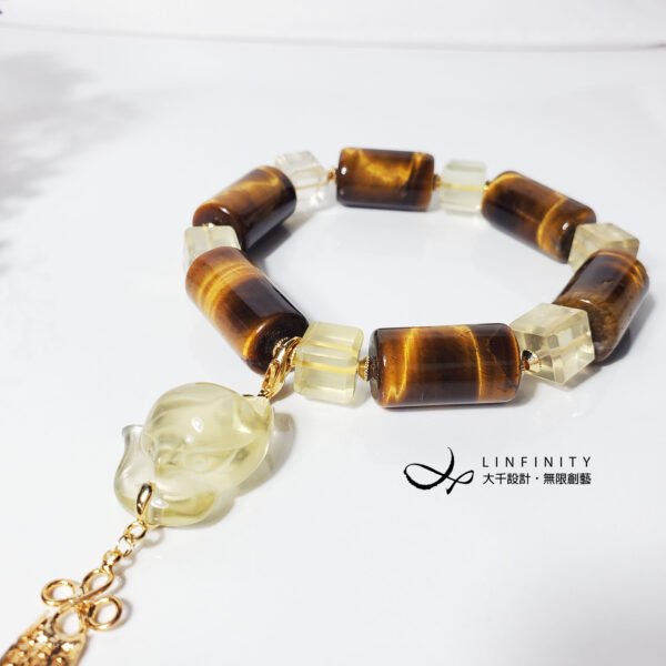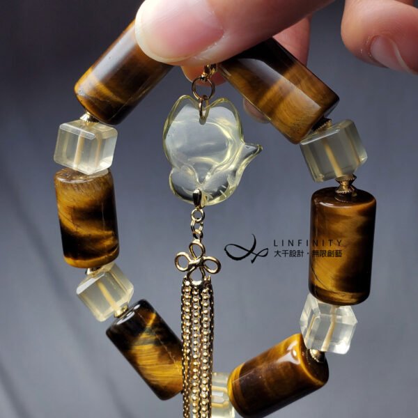 嚴選2種知名頂級財富寶石-黃水晶、虎眼石,虎眼石有別常見圓珠型,磨製霸氣圓柱飾,黃水晶為魔方珠飾,兩者相乘盡顯大器,體現天圓地方之氣宇,主飾以招財德獸-黃水晶狐仙,整理華美、金燦、霸氣不已、氣勢非凡。