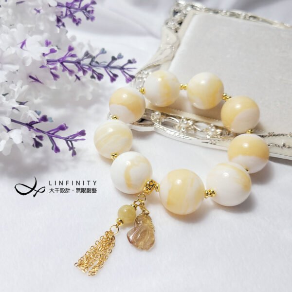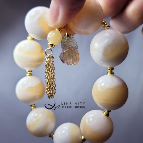 點綴以碧璽家族中罕見之金碧璽金魚(金玉滿堂)、K金鍊流蘇,碧璽玻璃淨體、火彩閃現、色彩雅致,與溫潤金硨磲相佐,不僅寶石寓意美,更是大器富貴、智慧靈性之夢幻收藏品。