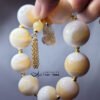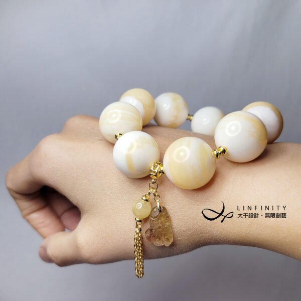 嚴選黃金硨磲,精工磨製大器珠型(20mm),硨磲白淨、瓷化程度高,金色玉化紋理若金龍翱翔,十分祥瑞貴氣。少天然冰裂、斑點,品相極美。