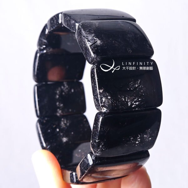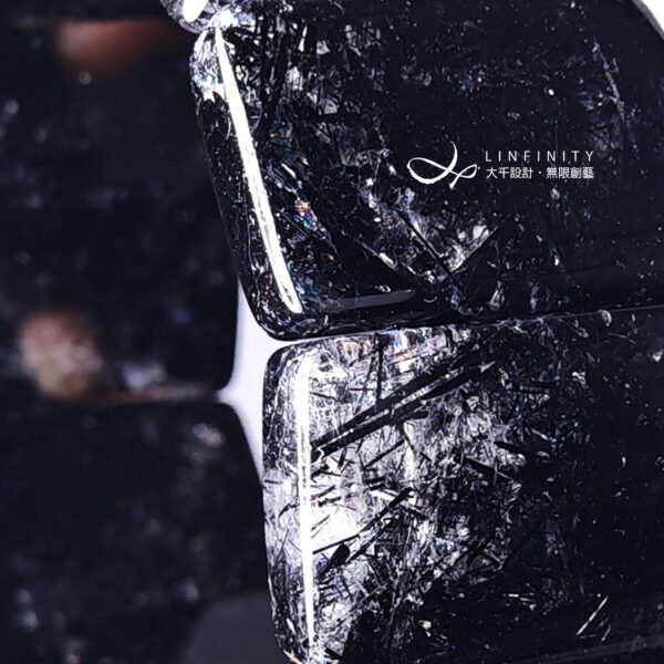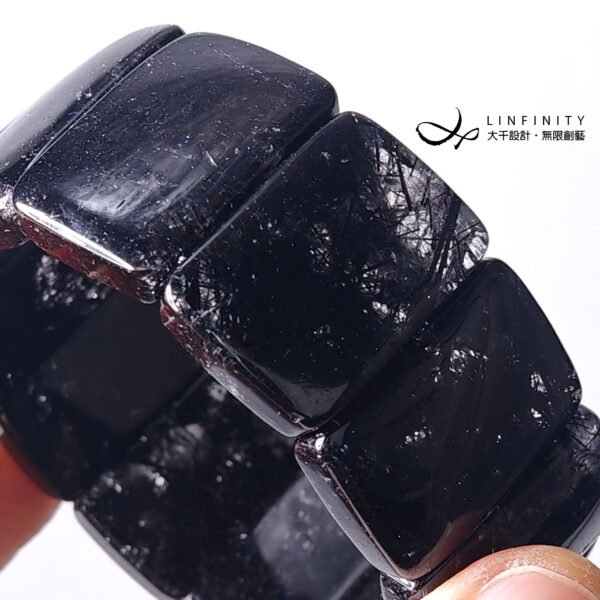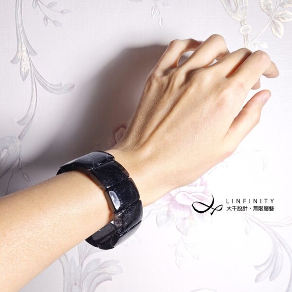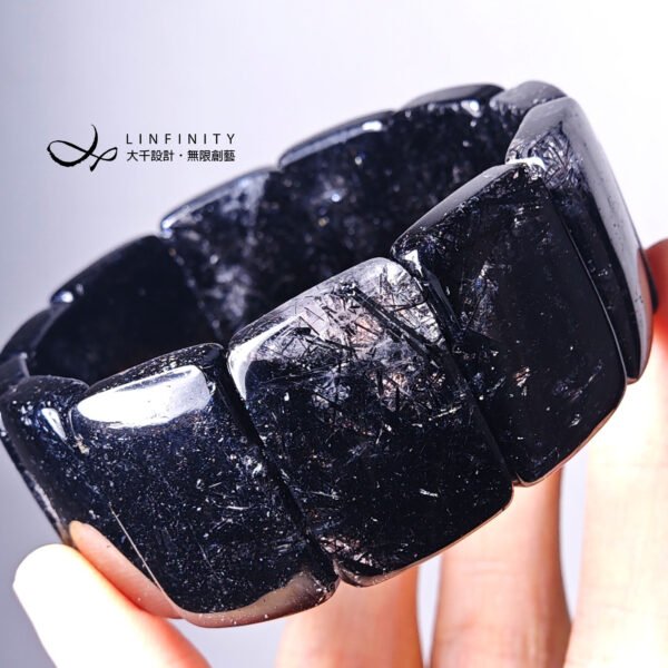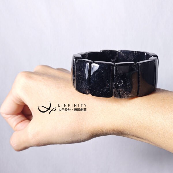 本件黑髮晶手排寬25mm,體碩霸氣,晶體清澈、滿佈黑碧璽針,火光極佳、局部閃現彩虹光,品相上乘優越,領袖風範十足、氣宇非凡,是事業成功、收藏級別之夢幻寶石。