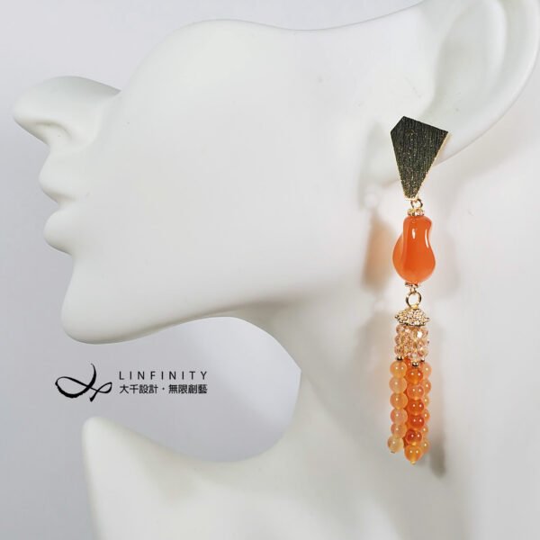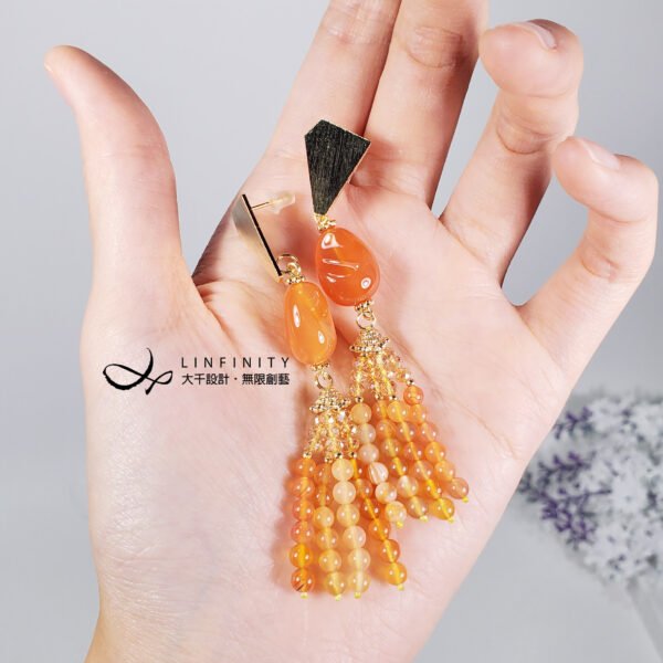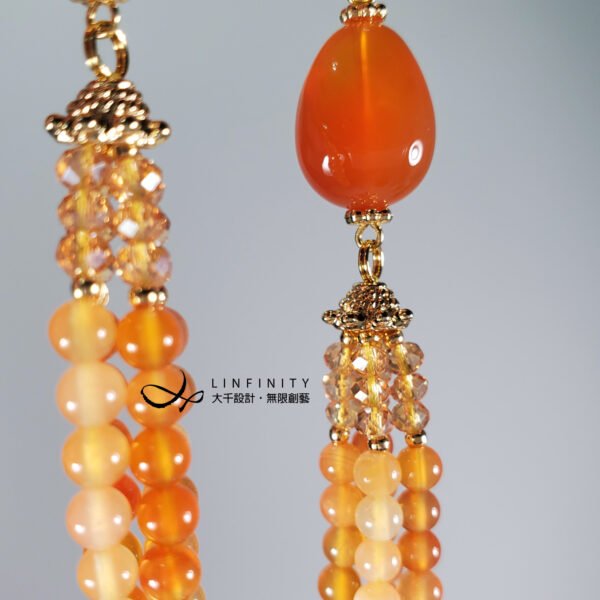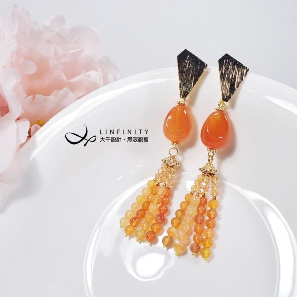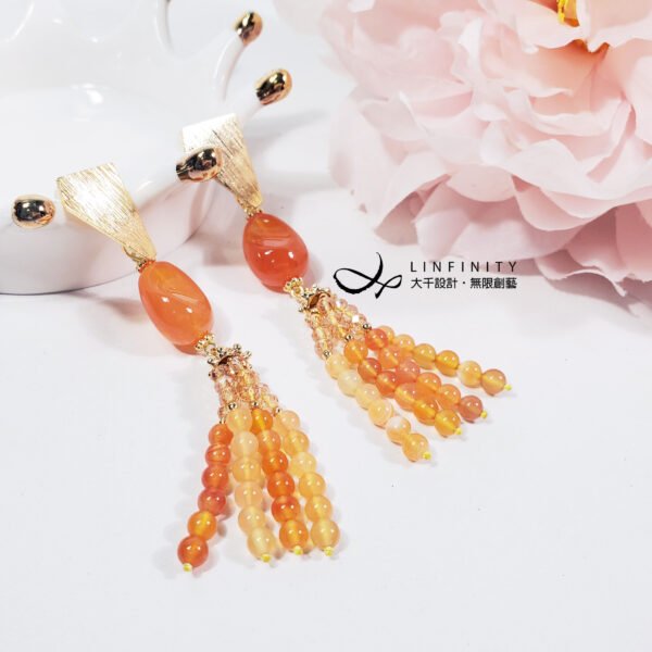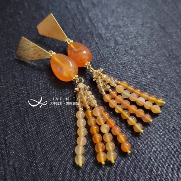 嚴選文理清晰獨特、透水度高、色彩飽滿之橘色纏絲瑪瑙,相佐典雅流蘇造型,富貴華麗,亮麗、優雅而動人。