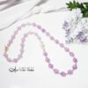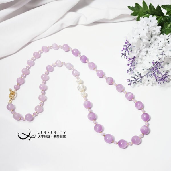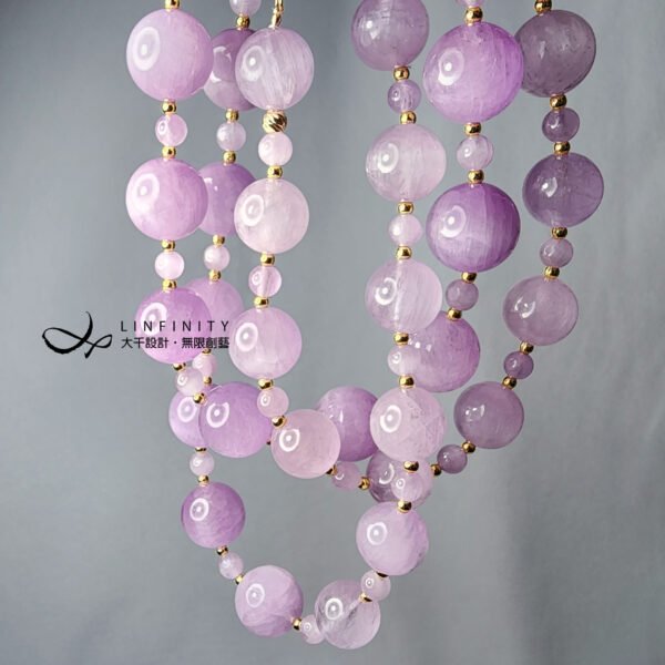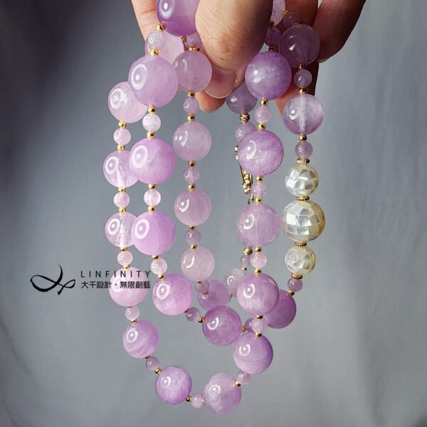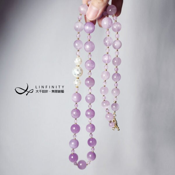 1.圖上紫鋰輝珠約5.3-14.3mm,項鍊總長度約76cm。