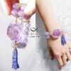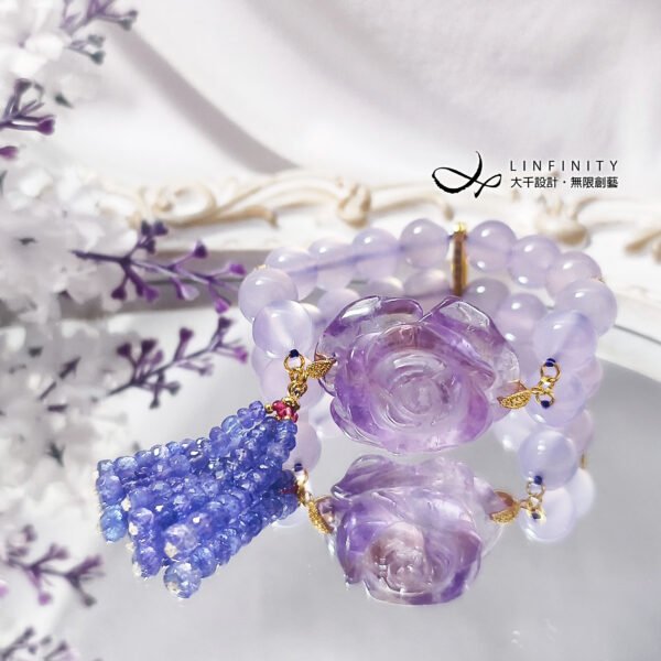 1.圖上紫黃晶玫瑰長約40mm、高約18.5mm,紫玉瓍珠約12mm,丹泉石流蘇高約40mm,整體手圍約17.5cm。