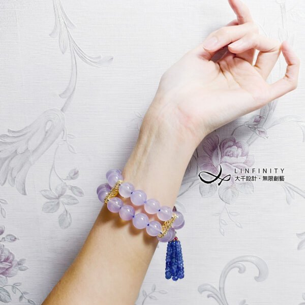 以丹泉石(坦桑石)編製流蘇,經典的藍紫色調極美,鑽切更添閃亮。
