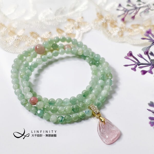 呼應綠藍晶石的綠,鍊身點綴溫柔的粉碧璽,以貓眼星光粉碧璽(雕如意、桃)為主墜,寓意如人所意、健康長壽。