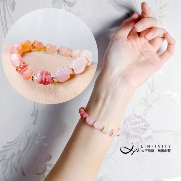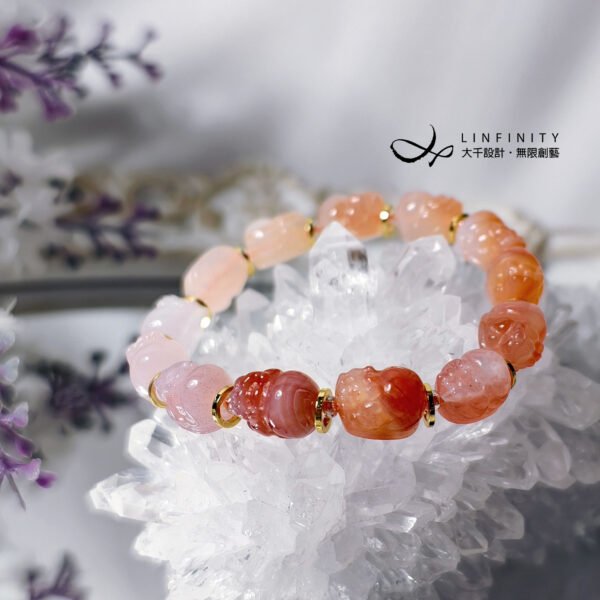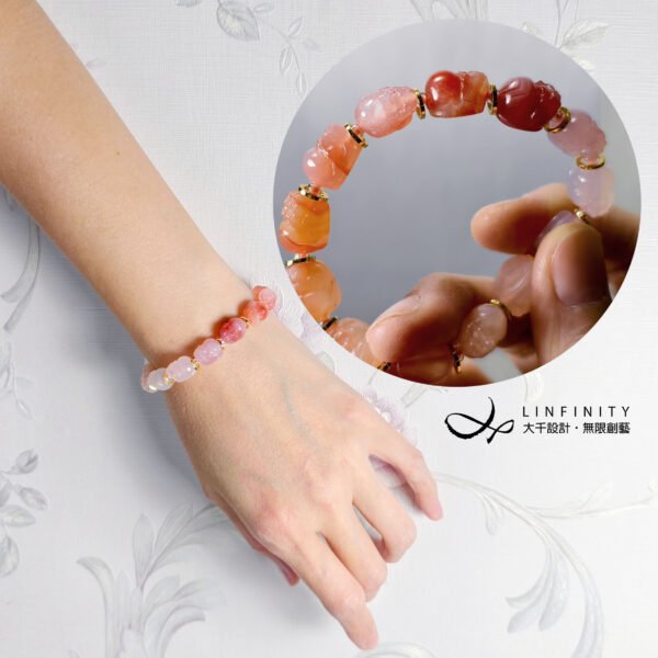 寶石以紅橘色系自然漸層排列,能見瑪瑙獨有的冰潤、帶眼、花紋、纏絲等多種紋理,無礦缺、無黑點,品相完整,色彩層次豐富,每一件都繽紛可愛、紋理獨具。