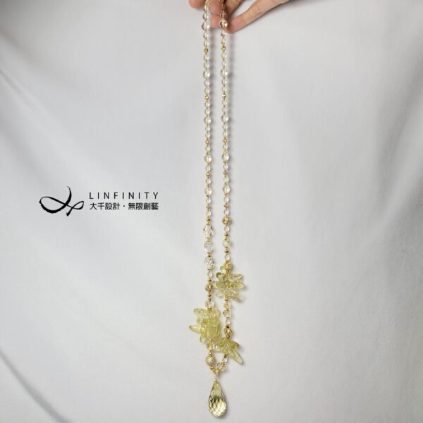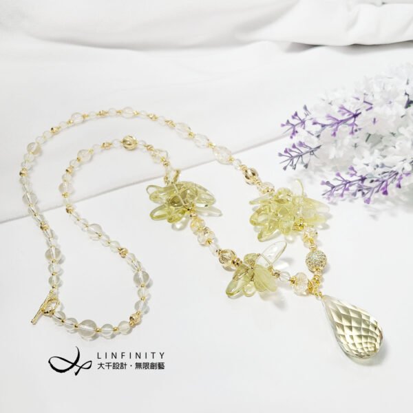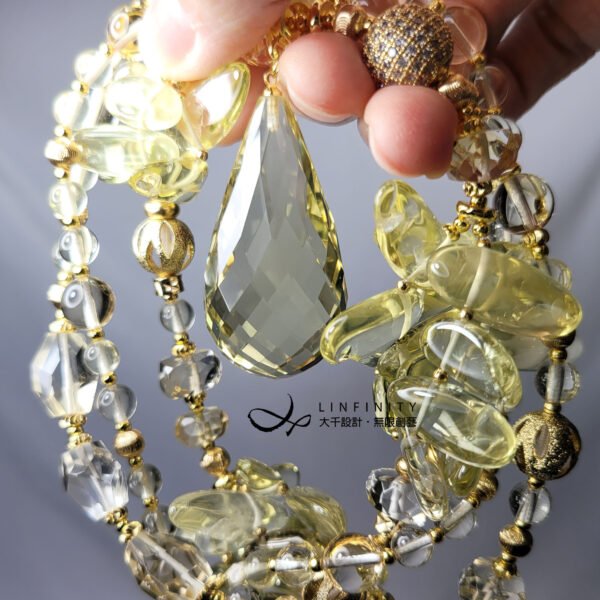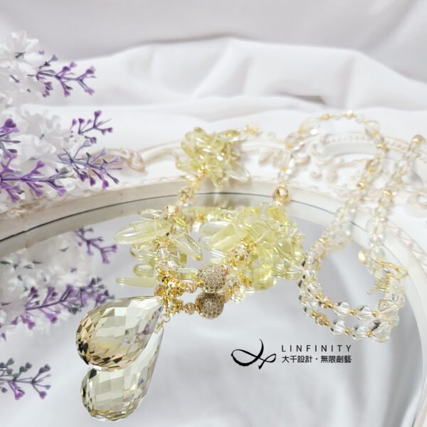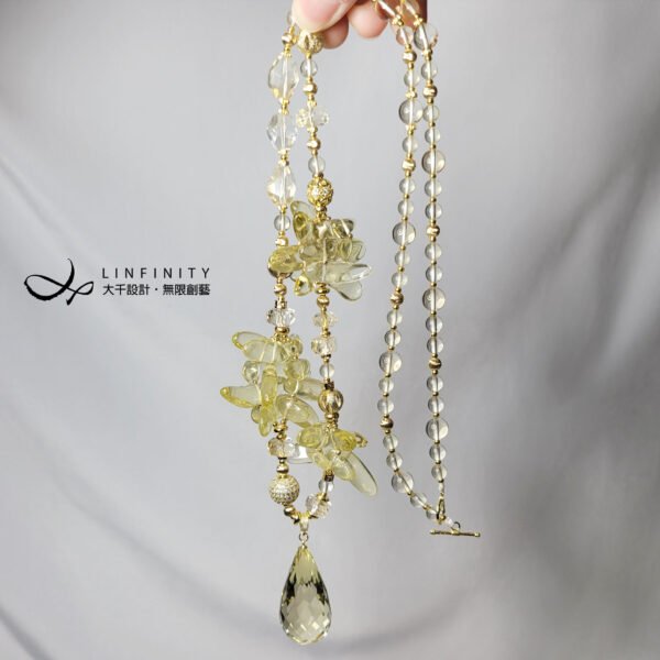 鍊身融合鑽面、隨型、圓珠等多寶(所願皆成)黃水晶珠飾,以花開富貴為概念設計,點綴以金鑽飾,匠心獨具,盡顯華麗與貴氣。