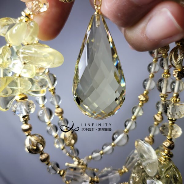 主墜黃水晶為頂級、全美、檸檬黃品種,淨體、色清雅、無瑕、無礦缺,精工磨製鑽面水滴型,閃耀奪目、放光動人。
