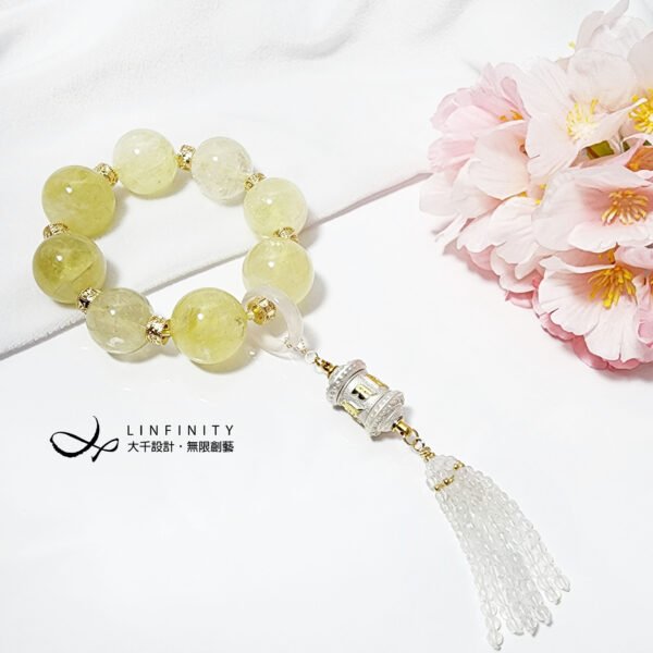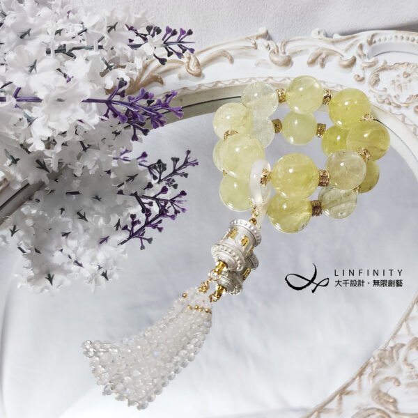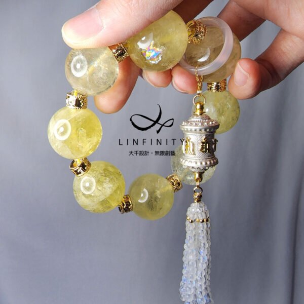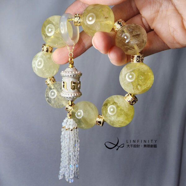 嚴選財富之石-黃水晶,相佐靈性第三隻眼-藍月光石、白玉瓍、六字真言轉經輪設計。