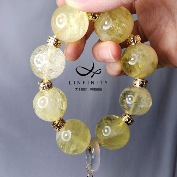 黃水晶球(20-23mm)體碩大器,球體大小韻律排列,匠心獨具。寶石色清亮、水光美、閃現彩虹光。