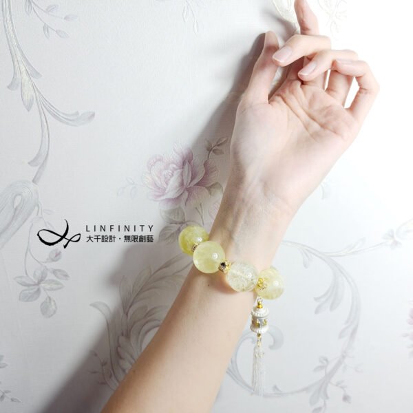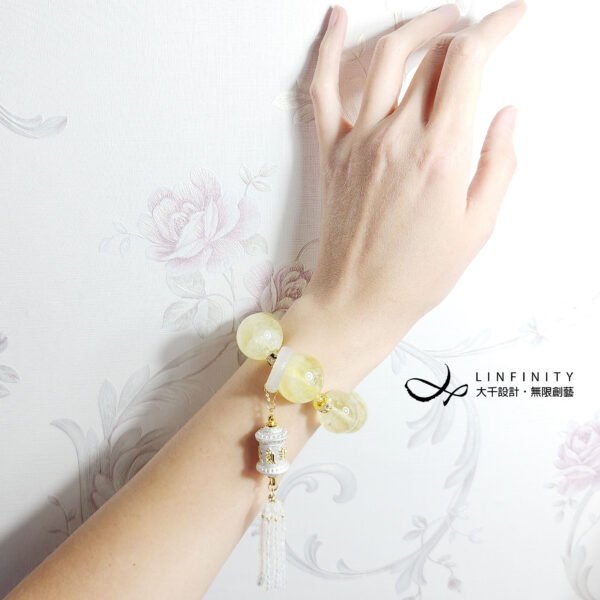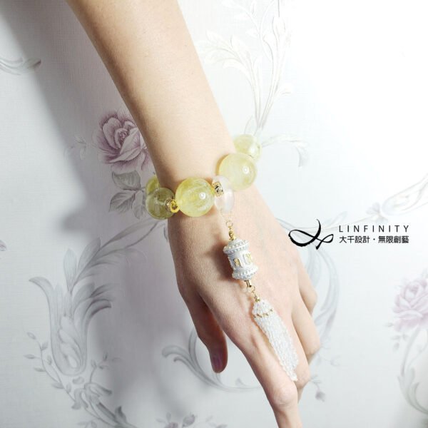 1.圖上黃水晶珠約20-23mm,轉經輪高約35mm,藍月光流蘇長約50mm,整體手圍約16.5cm。