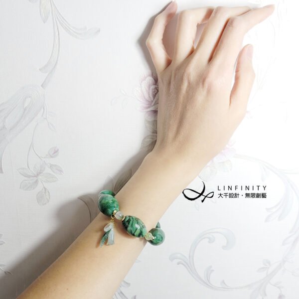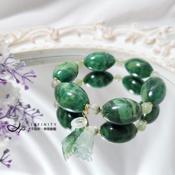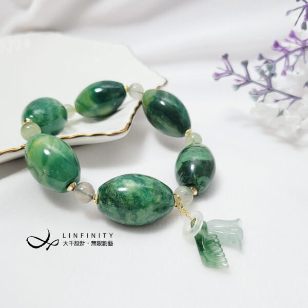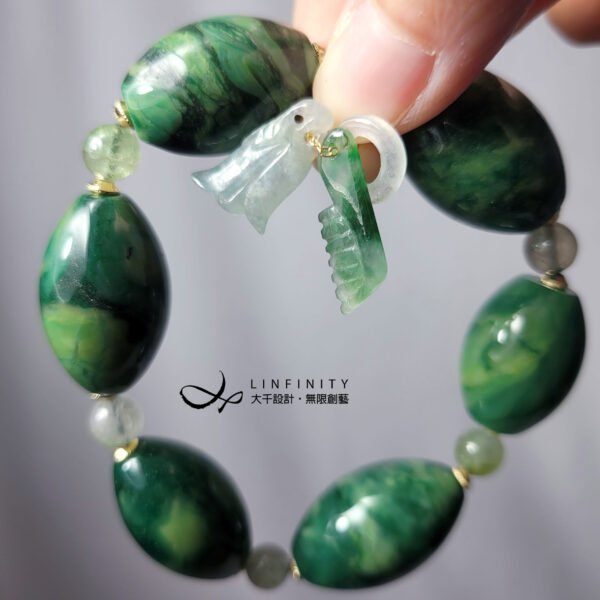 鍊身襯以薄荷綠碧璽,主飾黃綠翡翠梳子(一梳百順、成功順遂)、白翡古錢(一元復始)、飄綠翡翠花(花開富貴),整體透綠、翠綠、薄荷綠、乃至黃綠色調,使整體意境和諧,紋理富層次、亮麗大器,更有吉祥美好寓意^^。