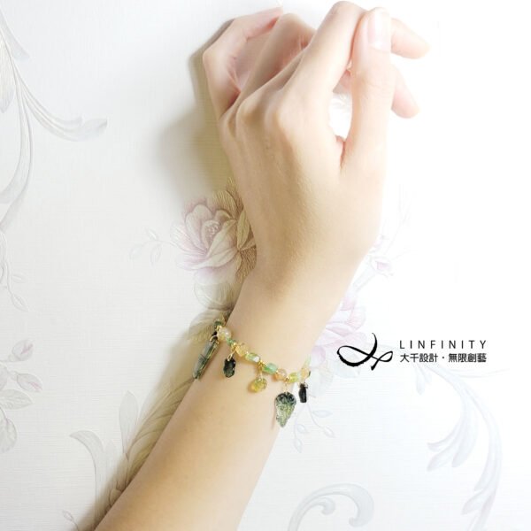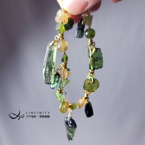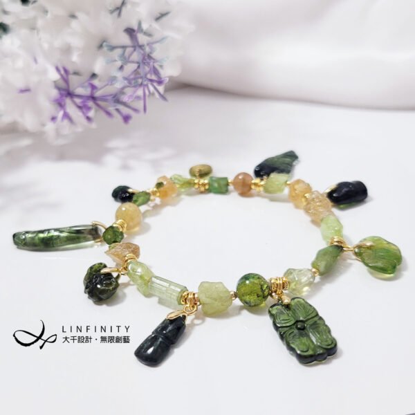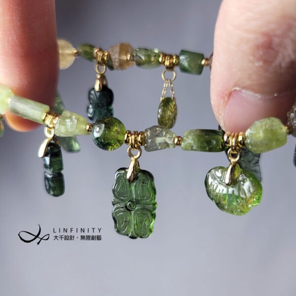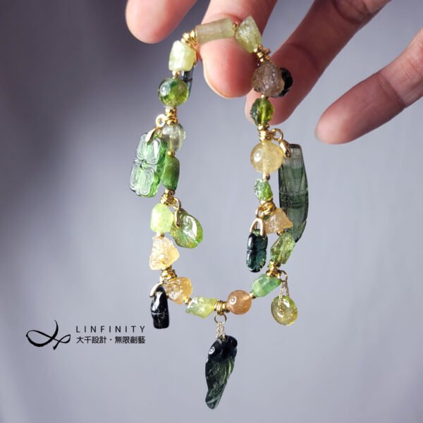 嚴選頂級黃綠西瓜碧璽,巧雕金魚(金玉滿堂)、竹節(節節高升、高風亮節)、古錢(招財、平安)、如意(如人所意),多寶釧概念設計,寶石件件色彩勻淨、火彩閃耀,鍊身設計綠意盎然、金光燦燦,不僅時尚亮麗、細緻優雅,更是寓意吉祥。