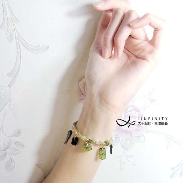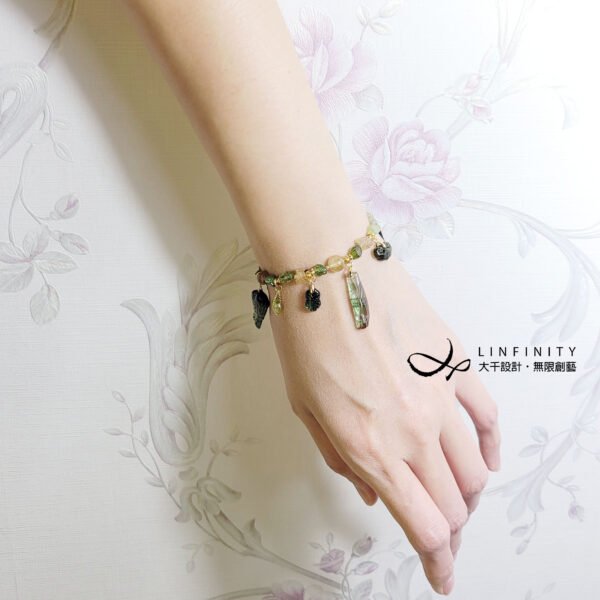 1.圖上碧璽金魚高約20.5mm,竹節高約24.6mm,鍊身碧璽(珠型、礦型)約寬4-7.5mm,整體手圍15.5cm。
