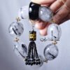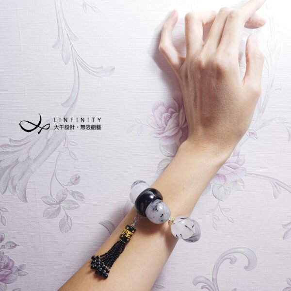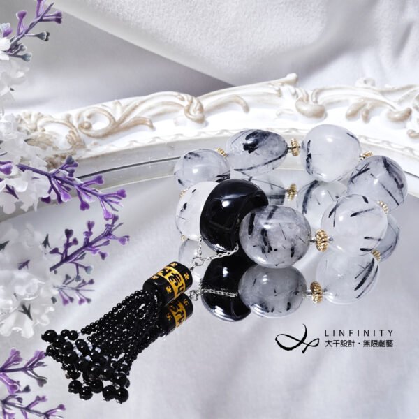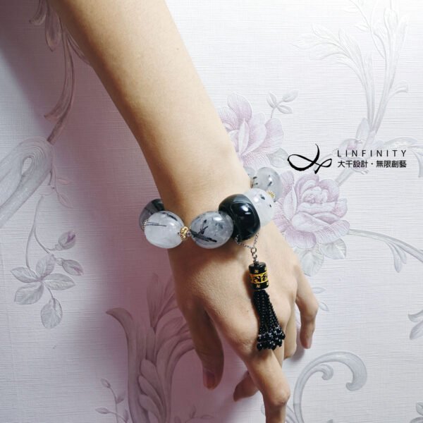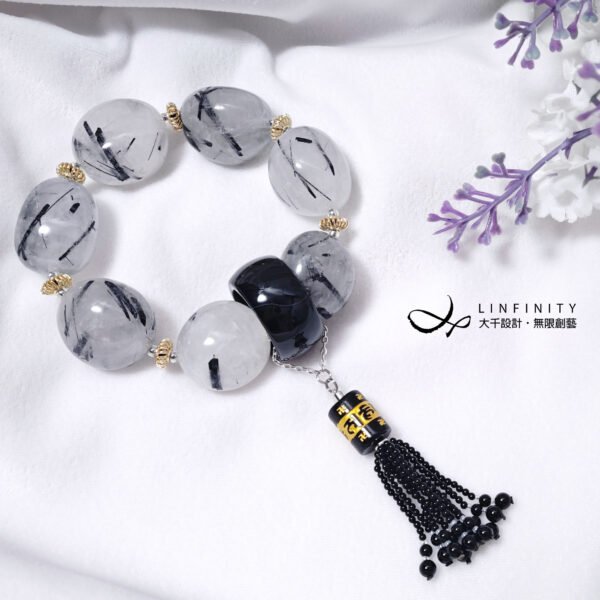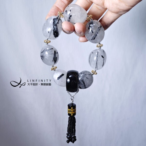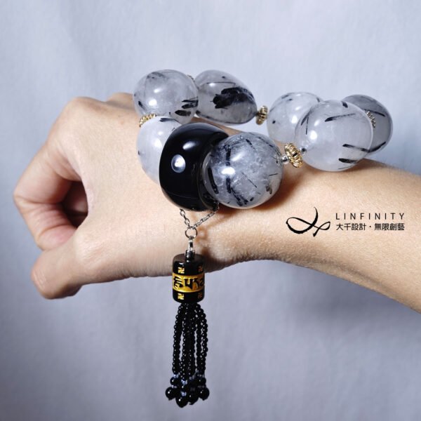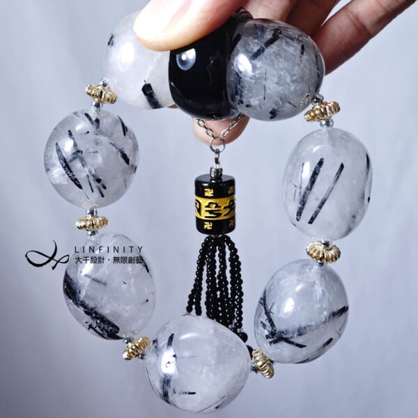鍊身以大器黑髮晶滾石為主調,黑髮晶內黑色針體為黑碧璽針,寶石透白底上可見明顯粗針體,黑、白相間,能量強勁,獨特美麗。